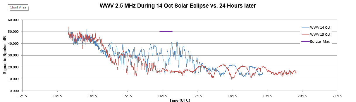 At 2.5. MHz, signals are expected to be subject to significant attenuation by D layer absorption during daylight hours. The onset of dawn is seen as a steady decrease in measured signal in the early range of both data sets. See the attached chart. As the eclipse progressed, there is a marked higher received signal in comparison to the same time the next day. It is to be noted that data is affected by reception of signals other than WWV that were audible on both days after WWV had faded. The effect is noticeable in the great variation in measurements obtained ~ 1500 to 1630 UTC. There is a later (17:30 to 19:00 UTC) smooth periodic variation in measured signal. This variation is offset between the eclipse and non eclipse data set. Additional non-eclipse data would be helpful in understanding this phenomenon, and any relevance to the eclipse event.